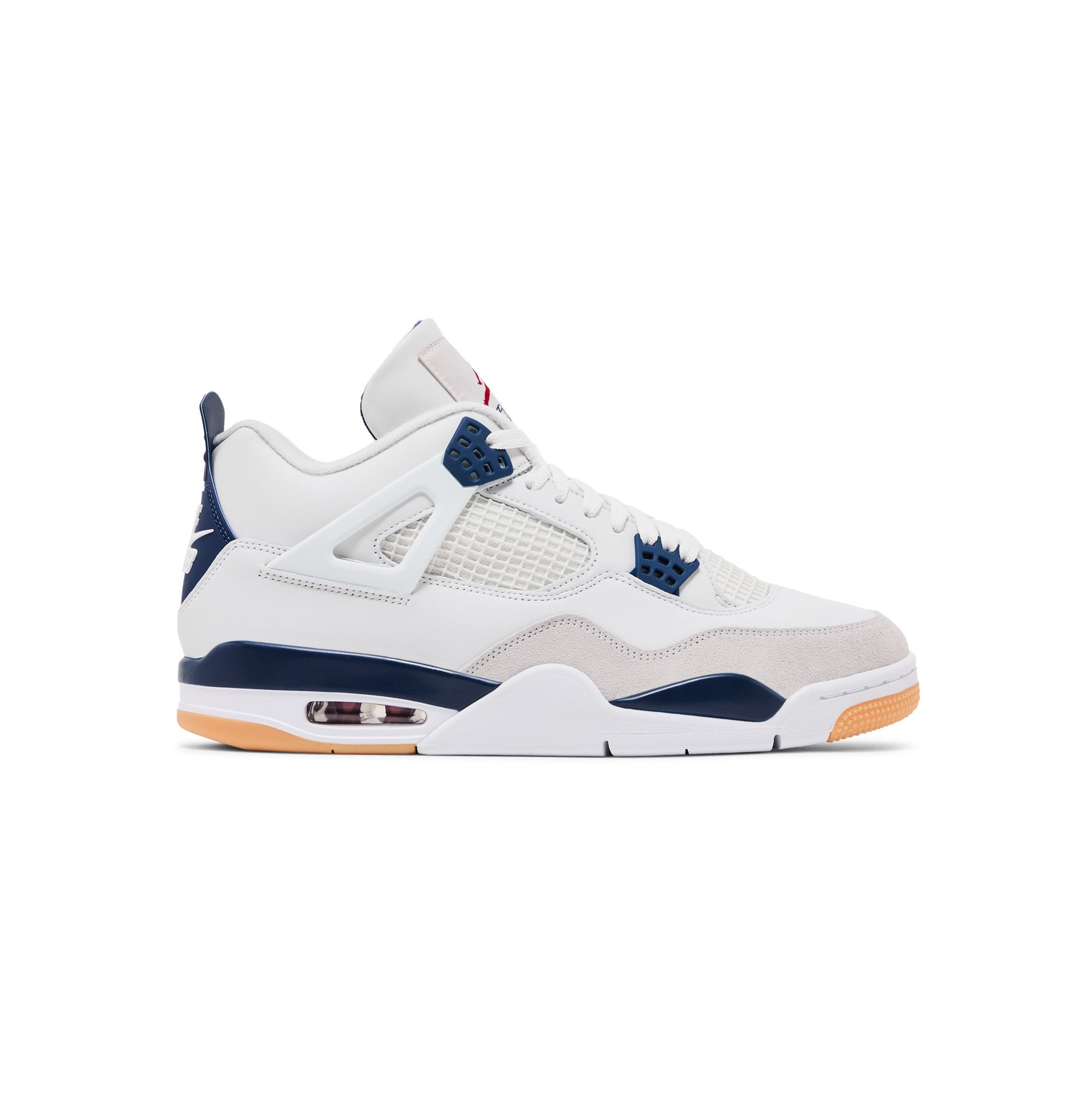 The Nike SB x Air Jordan 4 Retro SP 'Navy' treats Michael Jordan's fourth signature shoe to a skate-ready makeover. The legacy silhouette sports a white leather upper with a grey suede forefoot overlay and quarter panel netting. A crimson Jumpman adorns the woven tongue tag, while embossed Nike SB branding appears on the navy heel tab. Additional navy accents make their way to the molded eyelets and polyurethane midsole, which discards the encapsulated Air-sole unit in the forefoot but keeps the visible Air bag nestled in the heel. Underfoot, the herringbone traction outsole utilizes gum rubber in high-wear areas.