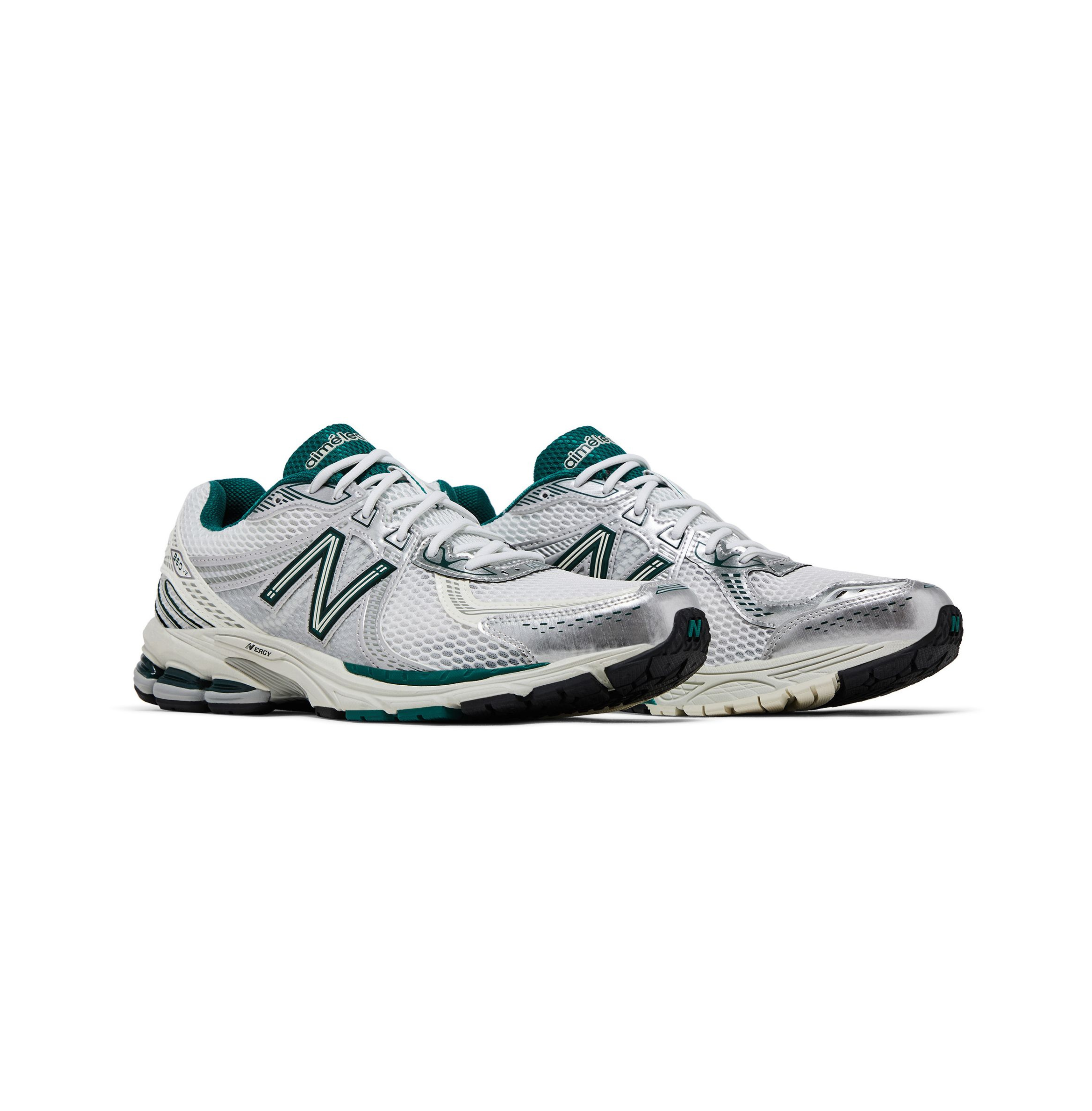 The Aimé Leon Dore x New Balance 860v2 'White Green' features a white open-cell mesh upper, fortified with synthetic leather overlays in matching white and metallic silver. Green textile lines the padded collar, matching the 'N' logo and tongue, marked with 'Aimé Leon Dore' in embossed lettering. The brand's floral crest logo decorates the back heel. Lightweight cushioning arrives via an ACTEVA LITE midsole with shock-absorbing N-ergy and ABZORB SBS pods in the heel.