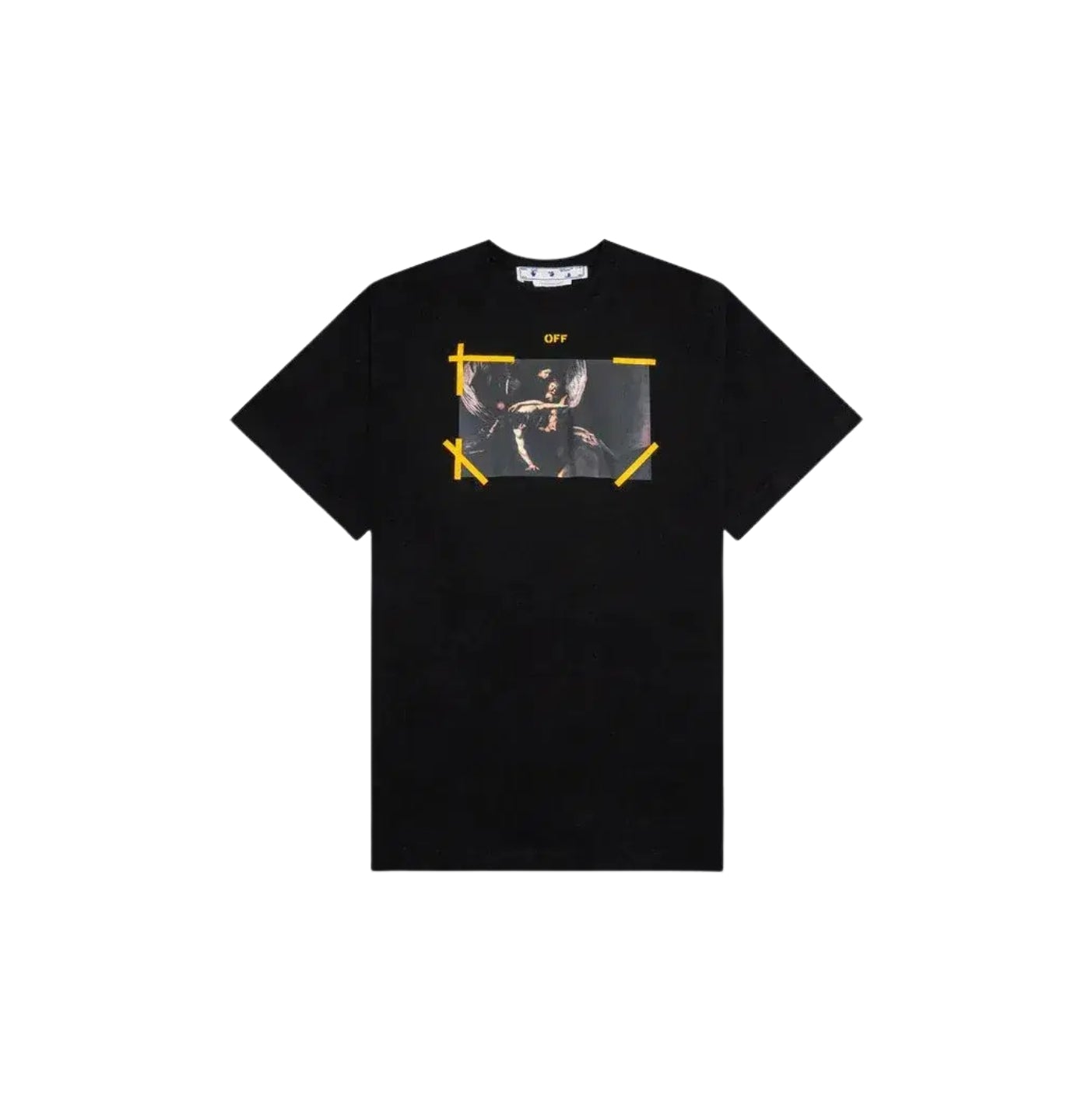 The Diag ARR Carav Mercy Skat Black Tee showcases a striking design that is both edgy and chic. It features the iconic Off-White diagonal stripes on the back, a signature of the brand's aesthetic, along with an intriguing 'Caravaggio' graphic on the front. The black colorway adds a touch of sophistication and versatility, making it a perfect fit for any outfit.